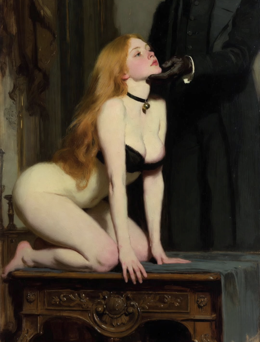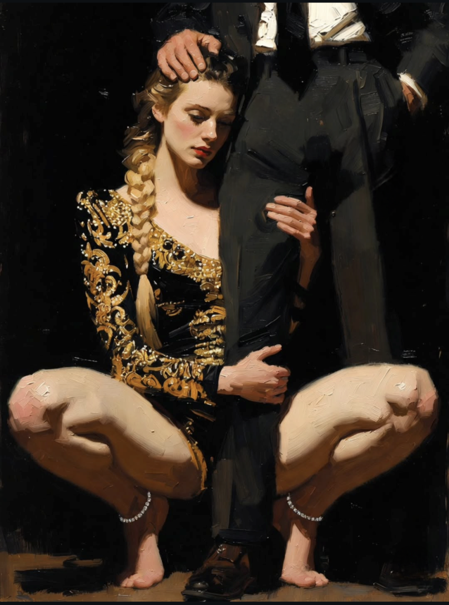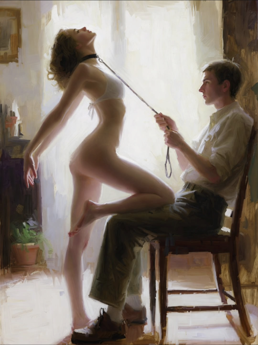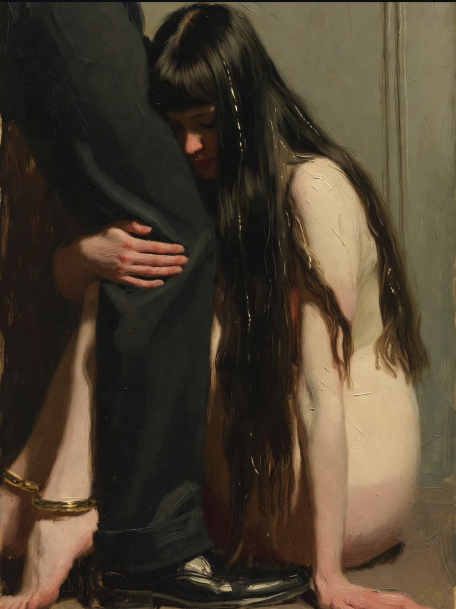 Sie posiert in einer klassischen sub-Haltung vor ihm
