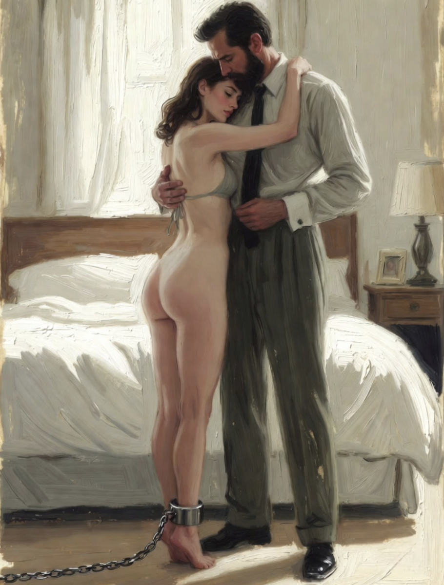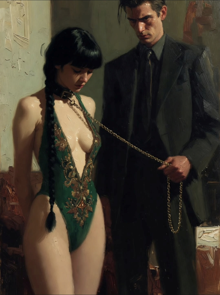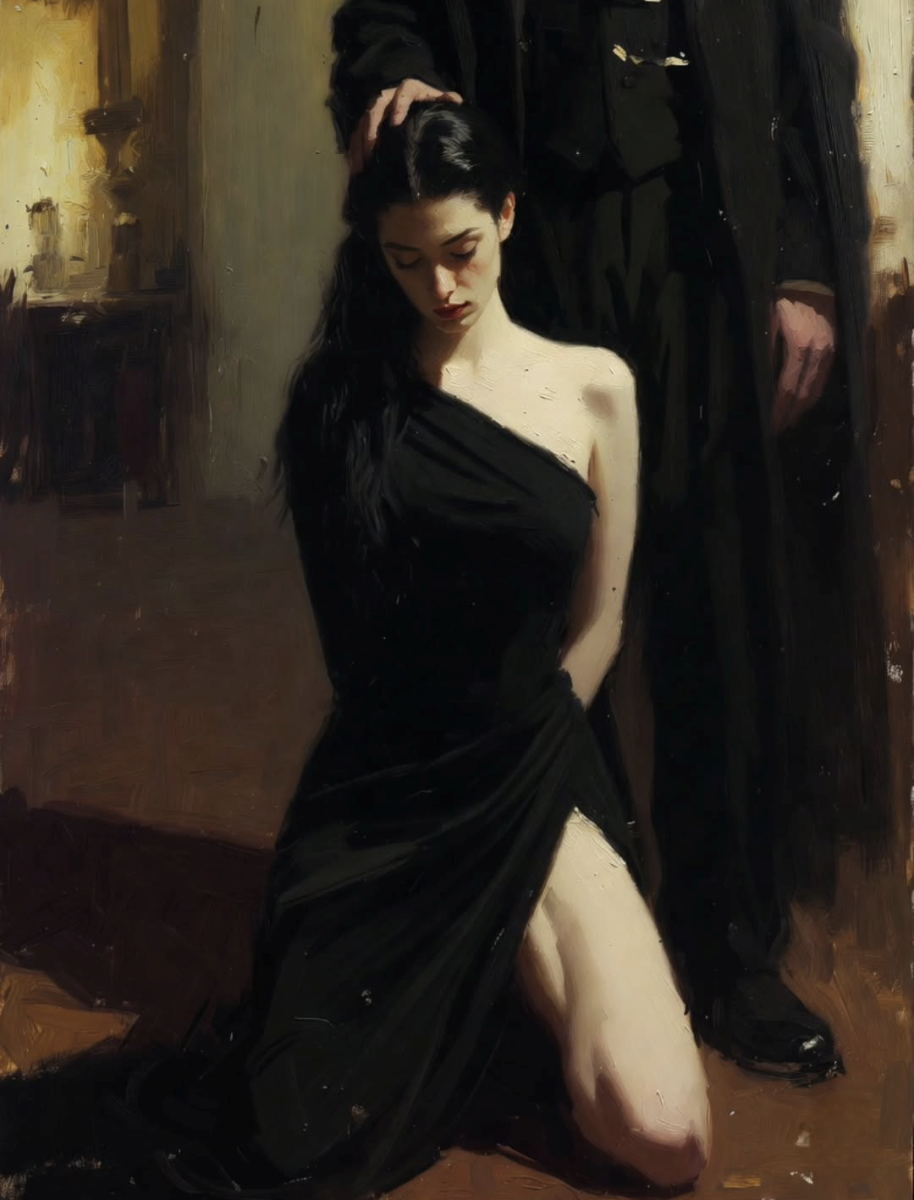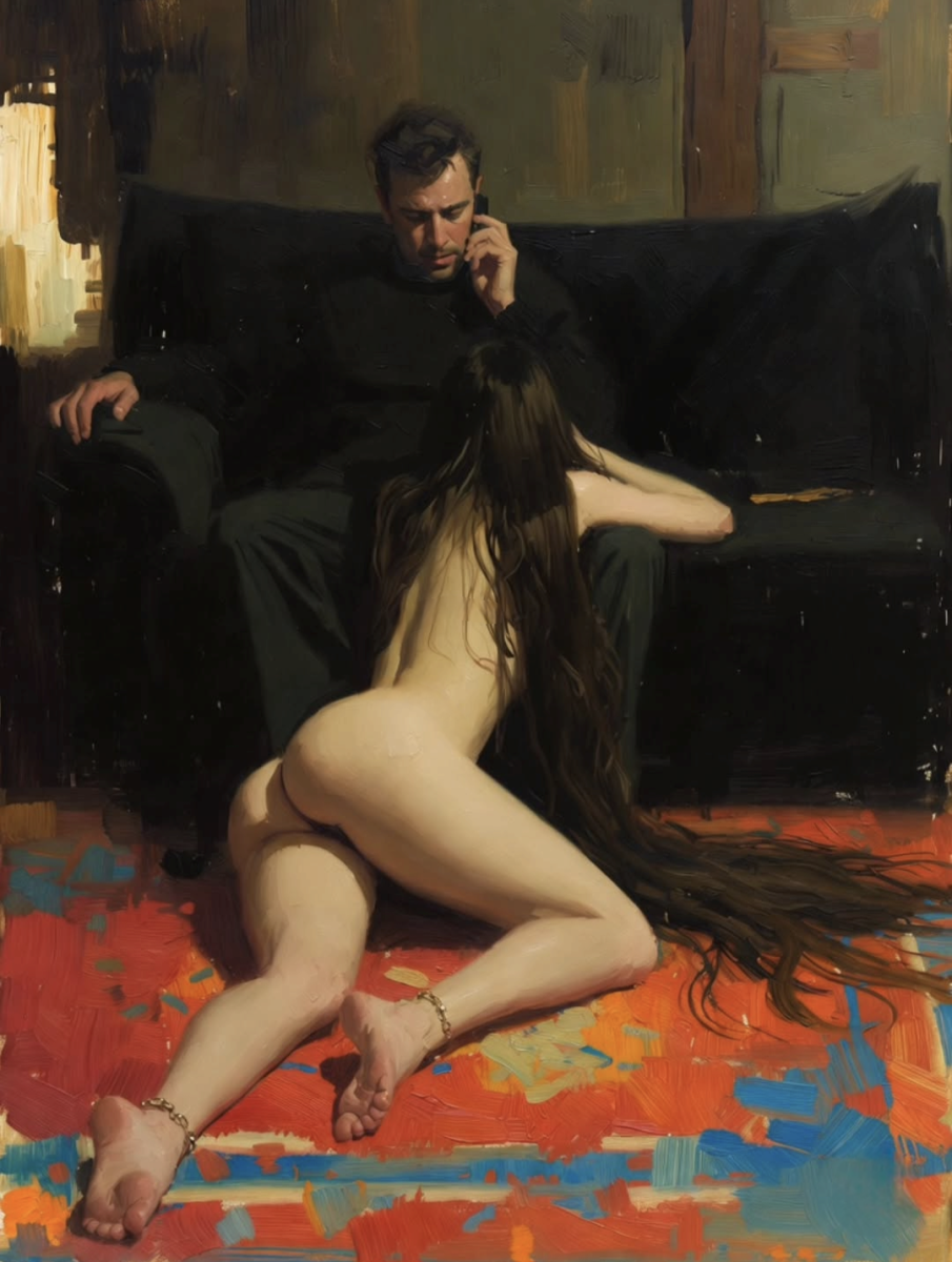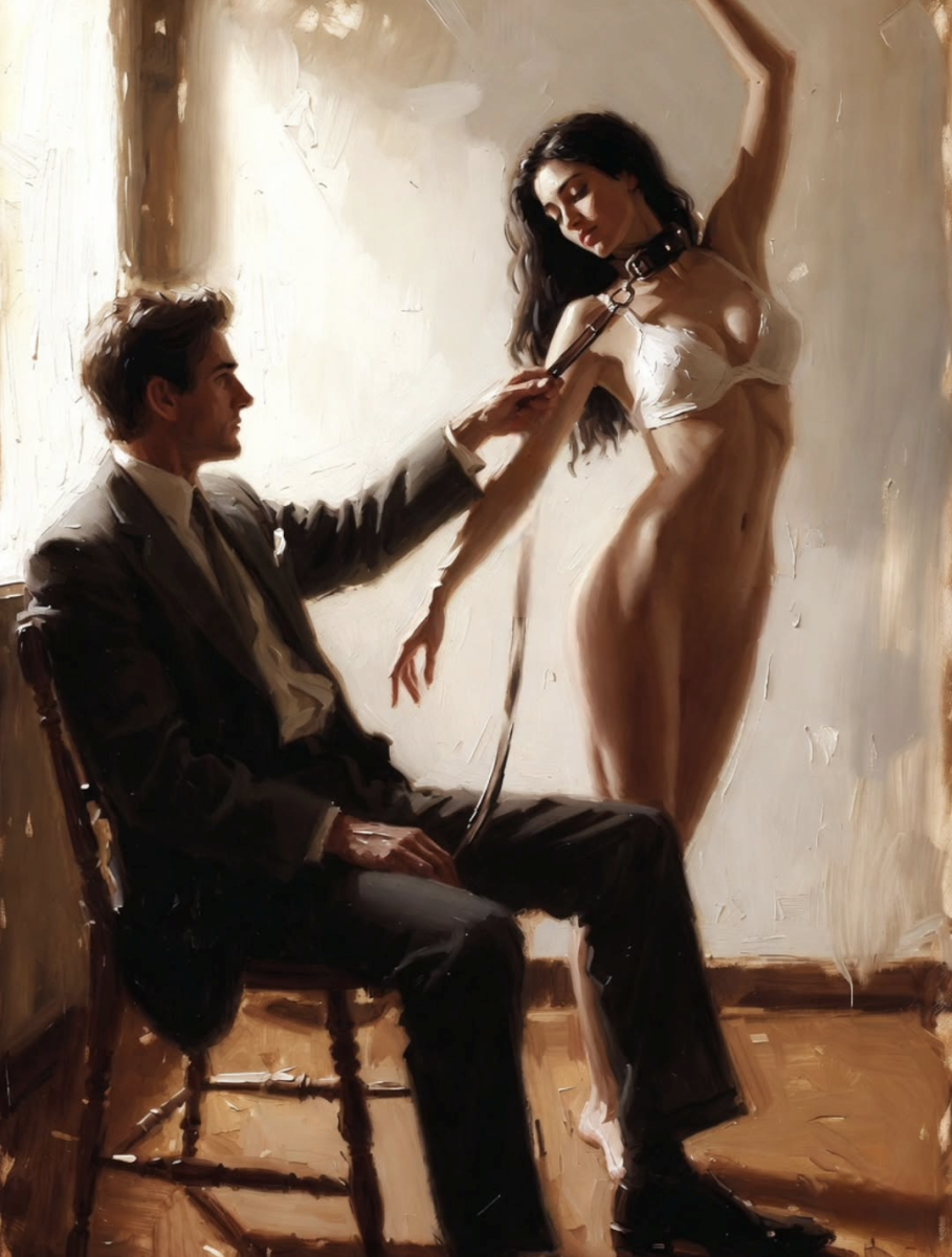 Sie posiert in einer klassischen sub-Haltung vor ihm
